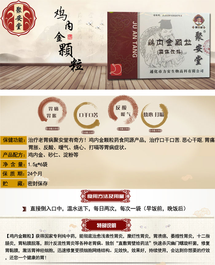 治療老胃病聚安堂有奇方!雞內(nèi)金顆粒藥食同源產(chǎn)品,治療口干口苦.惡心干嘔.胃痛胃脹.反酸.曖氣.燒心.打嗝等胃病癥狀,【雞內(nèi)金顆?!揩@得國家專利純中藥,能徹底治愈淺表性胃炎,糜爛性胃炎,胃潰瘍,萎縮性胃炎,十二指腸炎,胃粘膜脫落,膽汁反流性胃炎等各種老胃病。獨創(chuàng)“直敷胃壁給藥法”快速殺滅幽門螺旋桿菌,修復(fù)胃黏膜,激活胃神經(jīng)細(xì)胞,迅速修復(fù)受損細(xì)胞網(wǎng)絡(luò)結(jié)構(gòu)。見效快,效果好,持續(xù)使用,會達到你想要的療效,還您一個健康的胃!